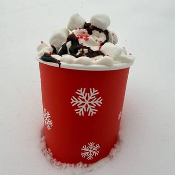 Our gourmet hot cocoa with steamed milk, fresh whipped cream, chocolate sauce, and mini marshmallows